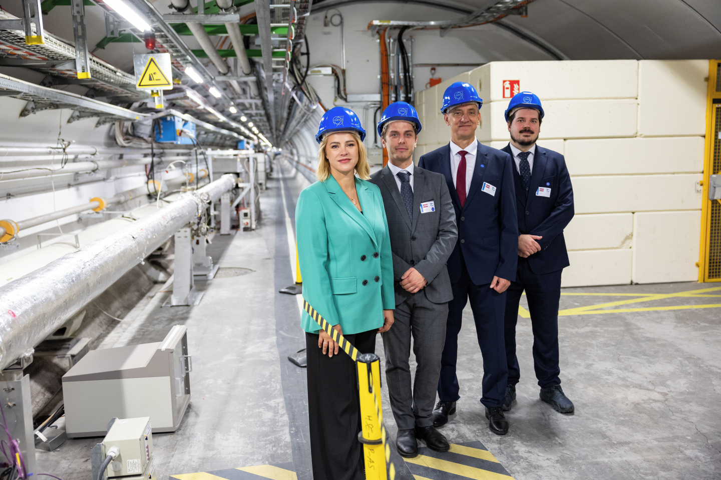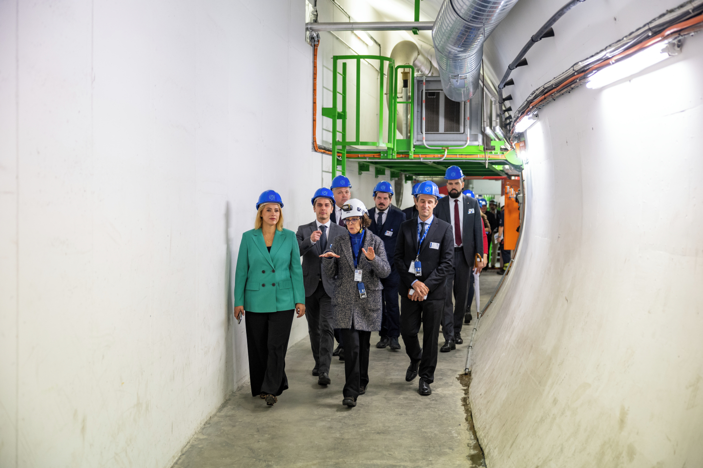 Premjerministre Evika Siliņa un citi Latvijas delegācijas pārstāvji zilās kiverēs iet pa CERN gaiteni