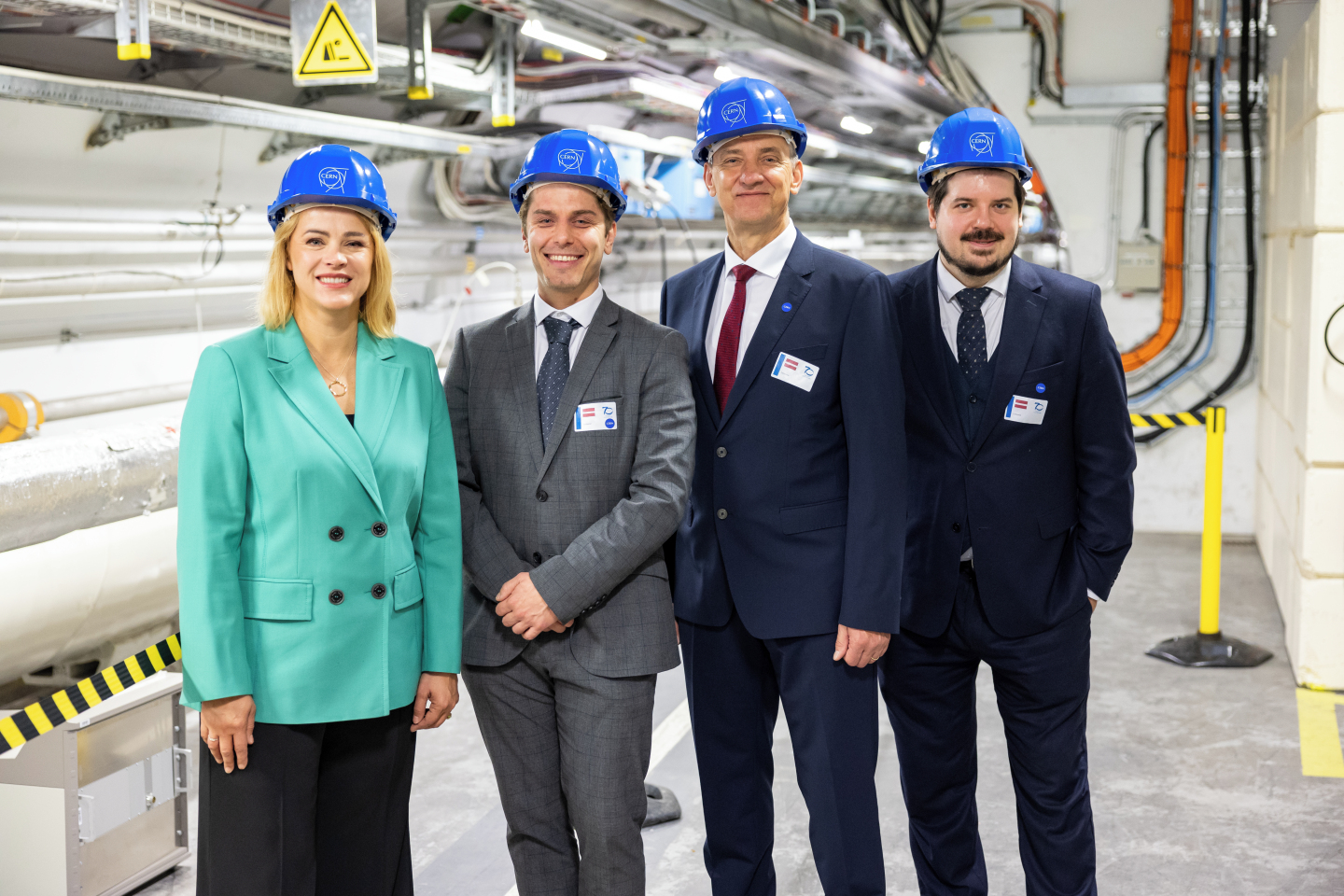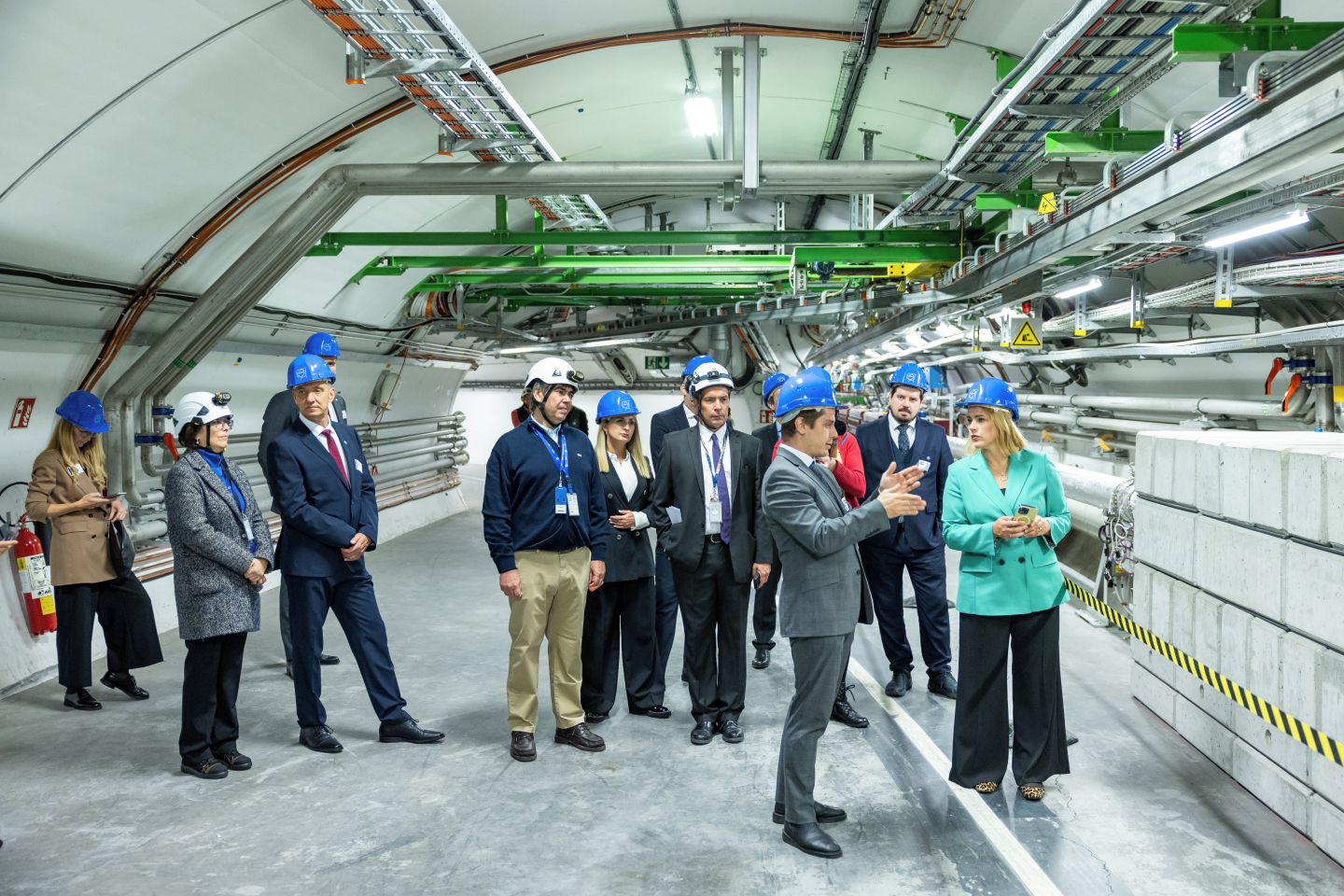 CERN pārstāvji stāsta un rāda telpas premjerministrei Evikai Siliņai un citiem Latvijas delegācijas pārstāvjiem. Visi atrodas industriālās telpās ar zilām ķeverēm galvās.