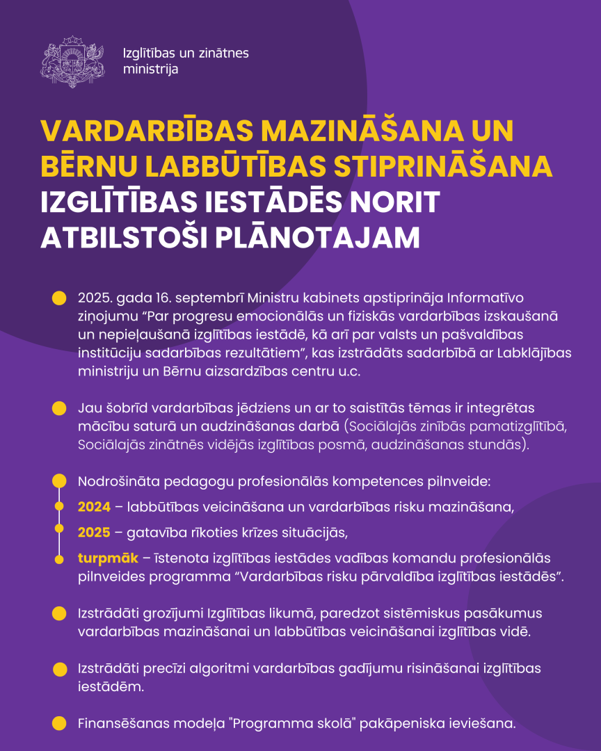 vardarbības mazināšana, novēršana un bērnu labbūtības stiprināšana izglītības iestādēs norit atbilstoši plānotajam; pārmetumi par neizdarībām ir nepamatoti