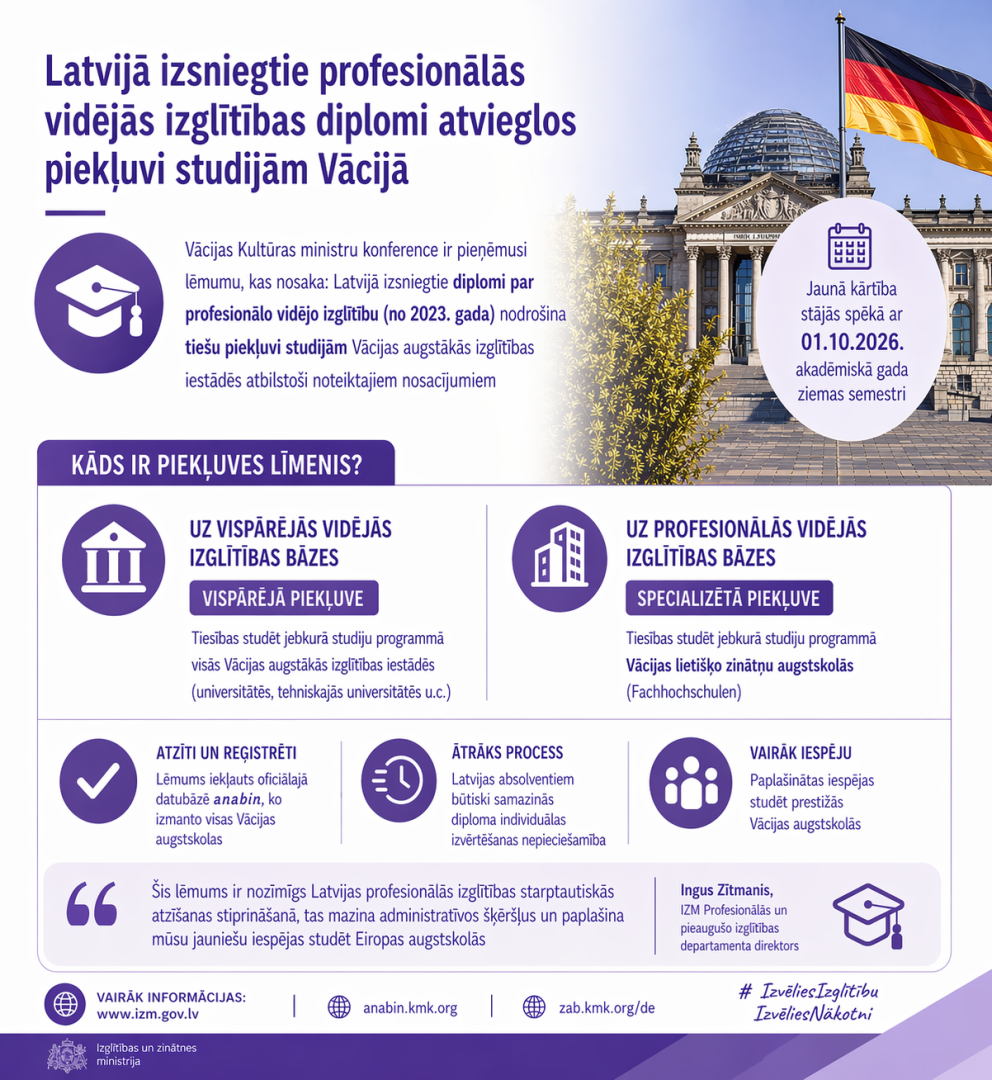 Latvijas profesionālās vidējās izglītības diplomi turpmāk tiks atzīti kā pilnvērtīgs pamats studiju uzsākšanai Vācijā. To apstiprinājis Vācijas Ārvalstu izglītības centrālais birojs, ieviešot jaunu un vienkāršotu kārtību Latvijas absolventiem. Šis lēmums nozīmē, ka profesionālo skolu beidzējiem no Latvijas būs vieglāk pieteikties studijām Vācijas augstskolās, bez sarežģītas un ilgstošas diplomu izvērtēšanas.