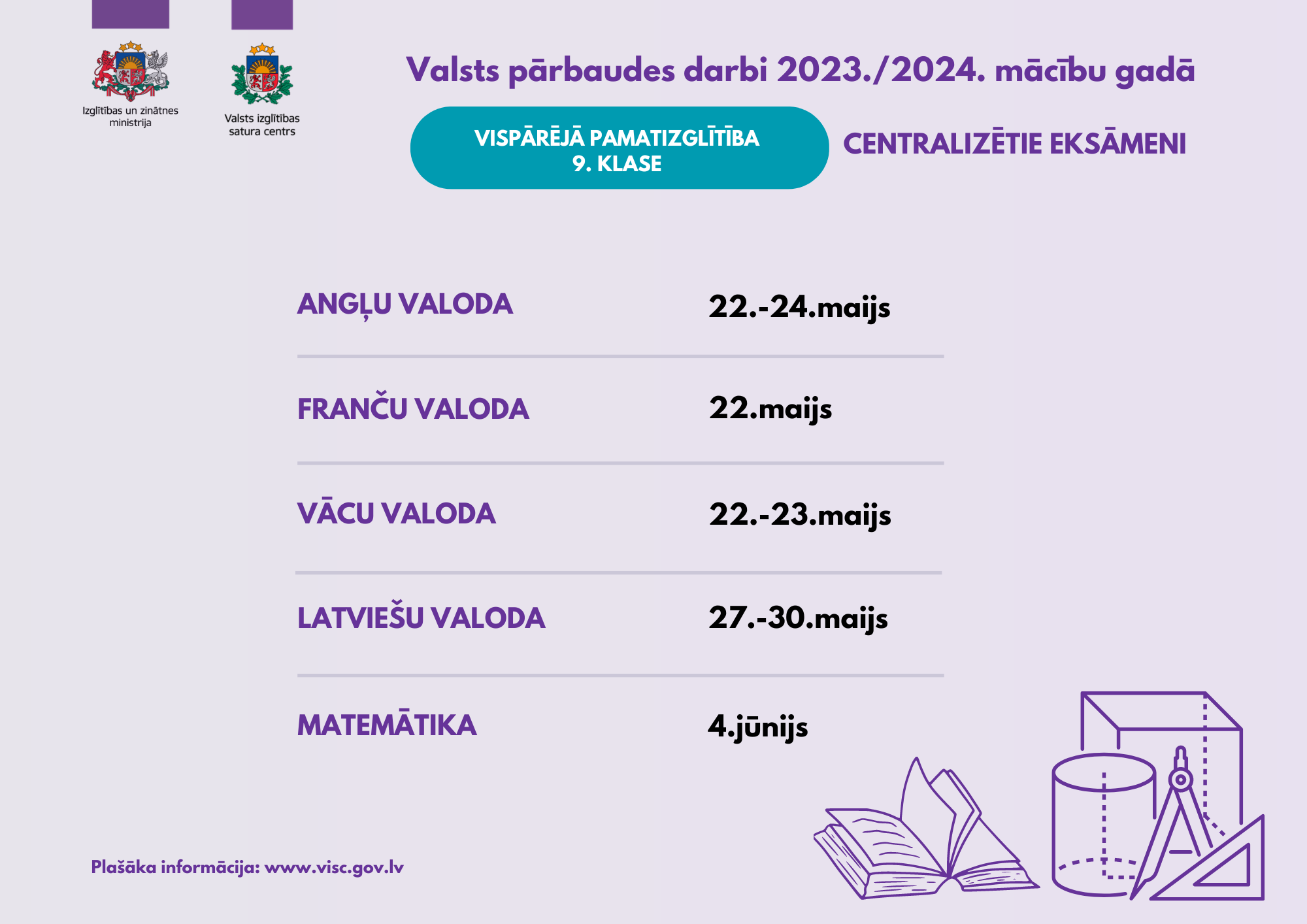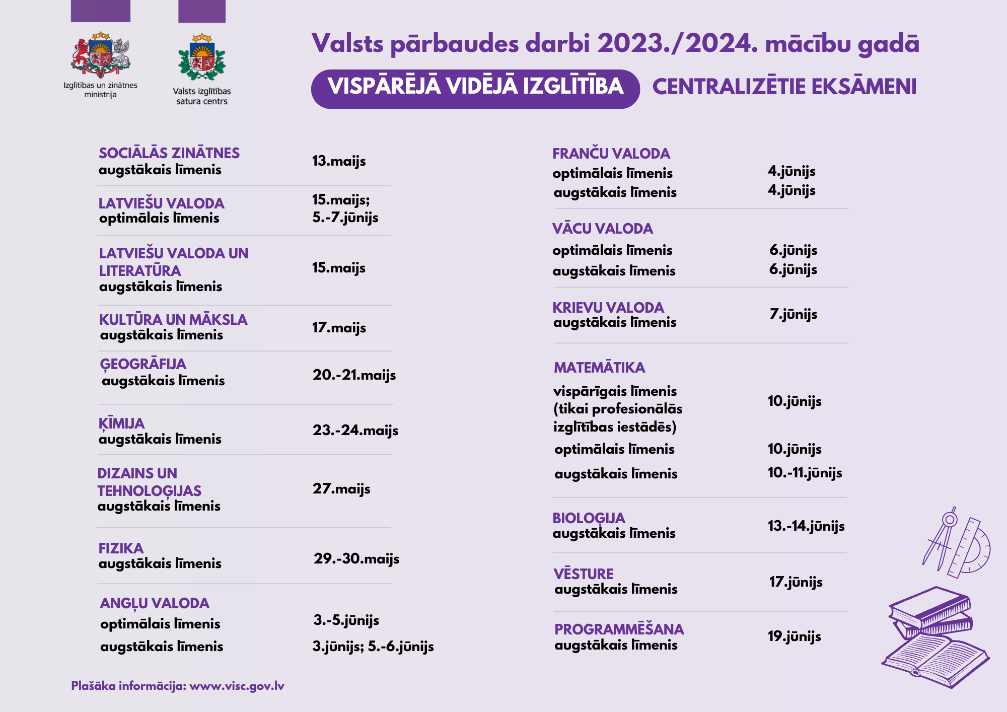 Vidusskolas vispārīgā un optimālā līmeņa matemātikas eksāmens pārcelts uz agrāku laiku – 10. jūniju, savukārt matemātikas augstākā līmeņa eksāmens – uz 10. jūniju (pirmā un otrā daļa) un 11. jūniju (trešā un ceturtā daļa). Tā kā vidējās izglītības centralizētos eksāmenus matemātikā kārto liels skaits skolēnu, operatīvākai eksāmenu vērtēšanas īstenošanai tie no 13. un 14. jūnija pārcelti uz 10. un 11. jūniju. Savukārt 13. jūnijā (rakstu daļa) un 14. jūnijā (praktiskā daļa) notiks augstākā līmeņa bioloģijas eksāmens.