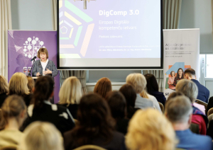Latvijas Informācijas un komunikācijas tehnoloģijas asociācijas (LIKTA) padomes locekle Māra Jākobsone prezentācijā “DigComp 3.0. ietvars – kas jauns un kāpēc tas ir svarīgi tieši pieaugušo izglītībā?” detalizētāk iepazīstināja ar DigComp 3.0, digitālo kompetenču līmeņiem, jomām un kompetencēm, kā arī mācību rezultātiem, kas ir vairāk kā 500.