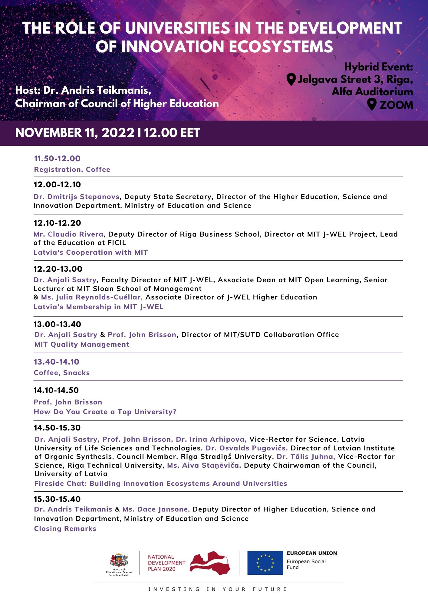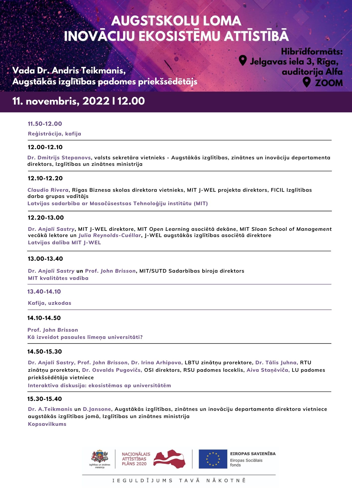 11. novembra pasākuma vadmotīvs ir “Augstskolu loma inovāciju ekosistēmu attīstībā”. Pasākumu vadīs Augstākās izglītības padomes priekšsēdētājs, Latvijas Mākslas akadēmijas profesors Dr. art. Andris Teikmanis. Šajā dienā Latvijā viesosies Masačūsetsas tehnoloģiju institūta un Abdul Latif Jameel Pasaules izglītības laboratorijas (MIT J-WEL) programmas pārstāvji no ASV, lai iepazīstinātu klausītājus ar šo programmu un pastāstītu par MIT pieredzi dažādās universitāšu pārvaldībai nozīmīgās jomās, piemēram, par MIT kvalitātes vadības nodrošināšanu, ekosistēmām ap MIT un faktoriem, kas izveidojuši MIT par pasaules līmeņa universitāti.
