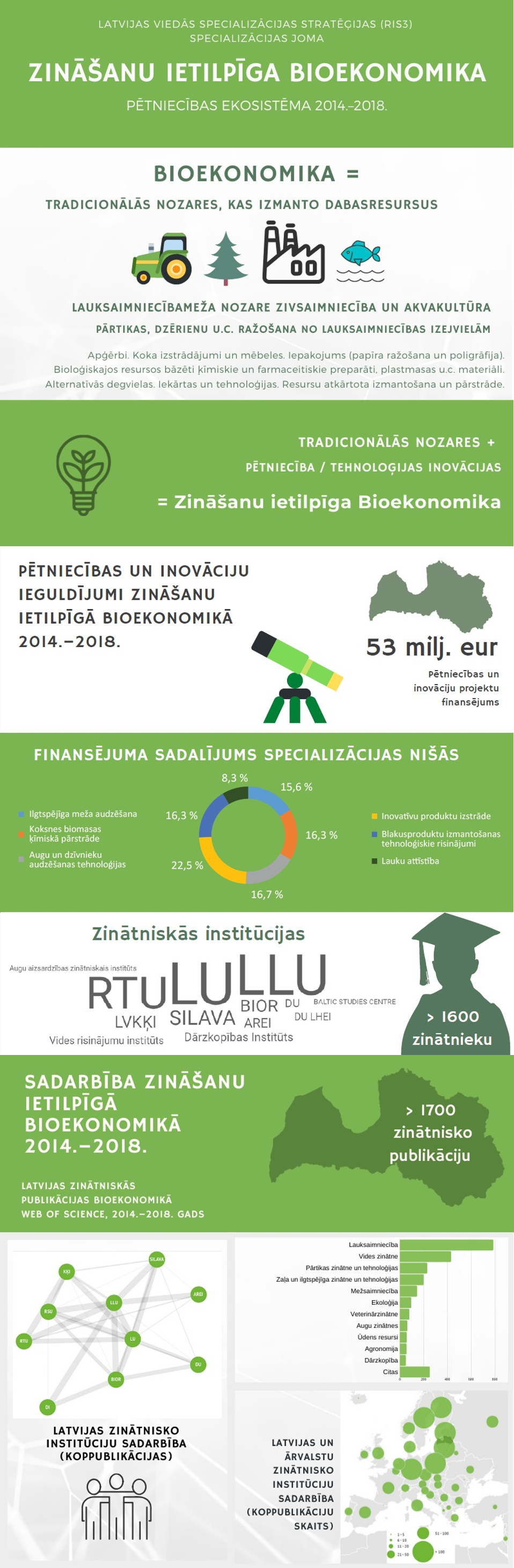 Galvenās pētniecības institūcijas Zināšanu ietilpīgas bioekonomikas attīstīšanā ir Latvijas Lauksaimniecības universitāte, Agroresursu un ekonomikas institūts, Dārzkopības institūts, Latvijas Augu aizsardzības pētniecības centrs. Papildus nozīmīgi spēlētāji ir Rīgas Tehniskā universitātes Vides aizsardzības un siltuma sistēmu institūts, Latvijas Valsts mežzinātnes institūts "Silava", Latvijas Universitātes Bioloģijas fakultāte, Ģeogrāfijas un Zemes zinātņu fakultāte un Mikrobioloģijas un biotehnoloģijas institūts, Latvijas Valsts koksnes ķīmijas institūts, Pārtikas drošības, dzīvnieku veselības un vides zinātniskais institūts „BIOR” un Baltic Studies Centre.